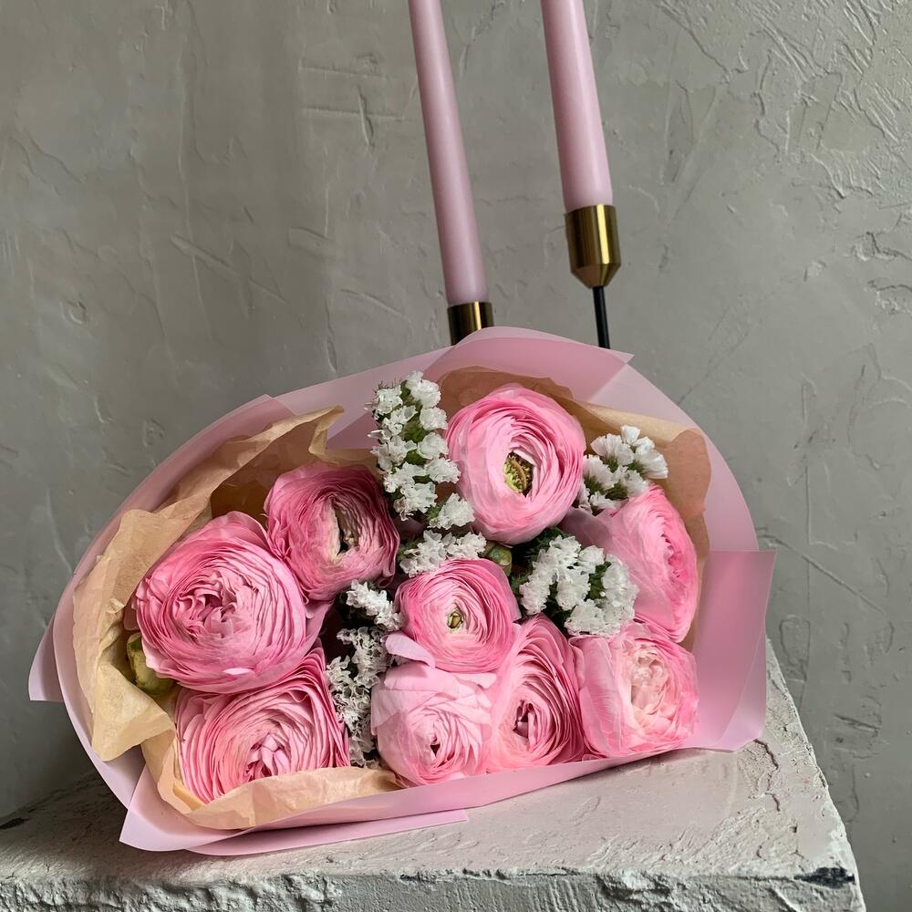Лента – 1 шт.Статица – 2 шт.Упаковка – 2 шт.Ранункулюс – 9 шт.
