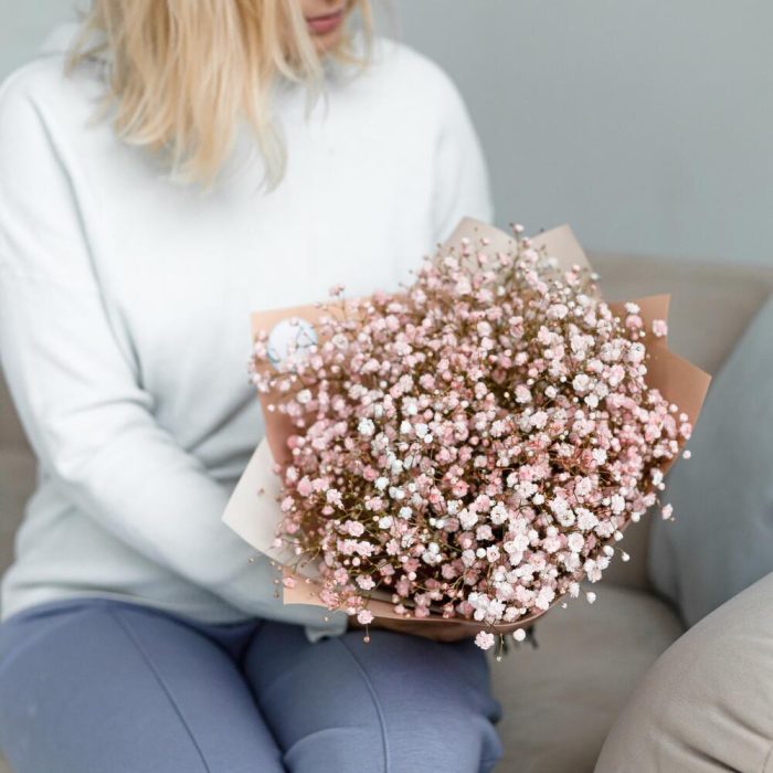 Гипсофила – 7 шт.Упаковка корейская пленка – 2 шт.Лента атласная – 1 шт.