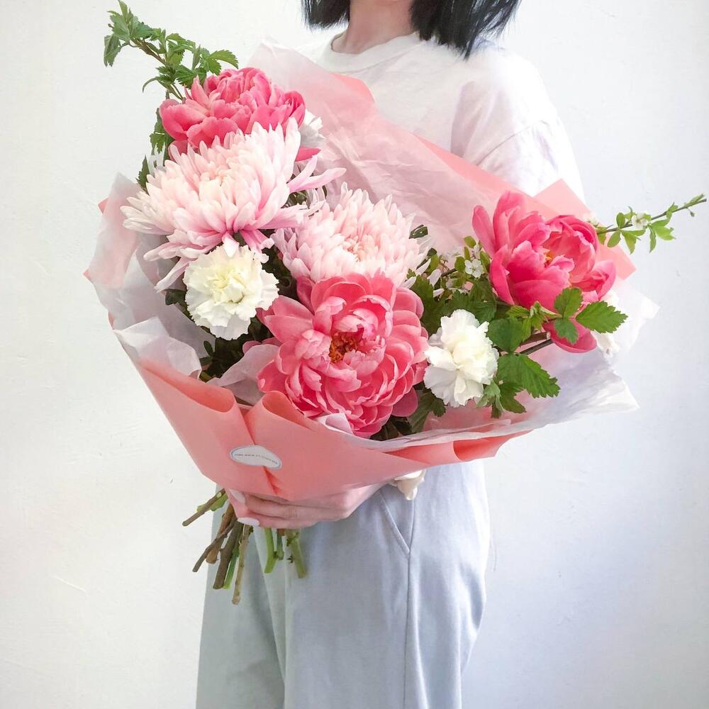Пион Коралл Шарм (Coral Charm) – 3 шт.Лента атласная – 1 шт.Тишью – 1 шт.Фисташка – 5 шт.Корейская пленка – 3 шт.хризантема антонов крашенный – 2 шт.ветки малины с листьями – 3 шт.даинтус – 4 шт.ветки яблони цветущие – 1 шт.авкапак – 1 шт.