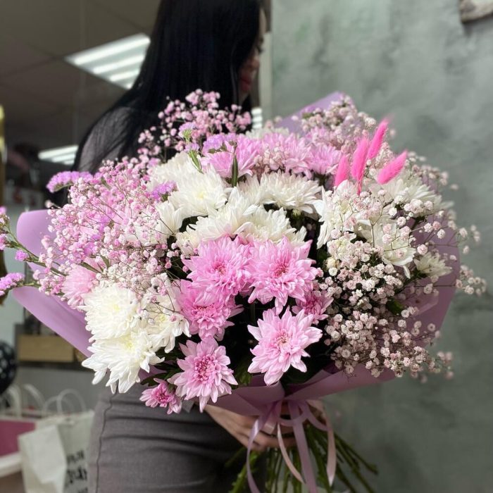 Хризантема кустовая – 13 шт.Статица – 2 шт.гипсофила радужная – 3 шт.Лагурус (сухоцвет) – 5 шт.Упаковка дизайнерская – 2 шт.Лента атласная – 2 шт.