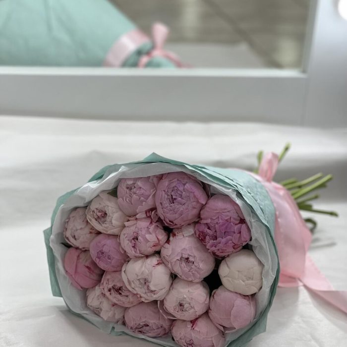 Атласная лента – 1 шт.Пион Сара Бернар – 17 шт.Дизайнерская упаковка – 1 шт.открыточка – 1 шт.