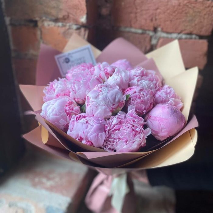 Букет из 15 розовых пионов в дизайнерской упаковке “Принцесса Маргарита”