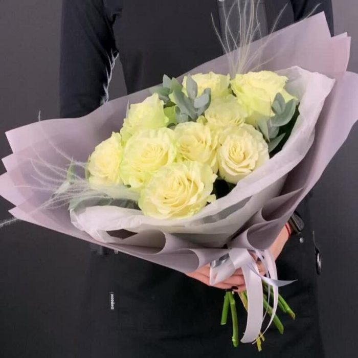 9 белых роз Мондиаль с эвкалиптом