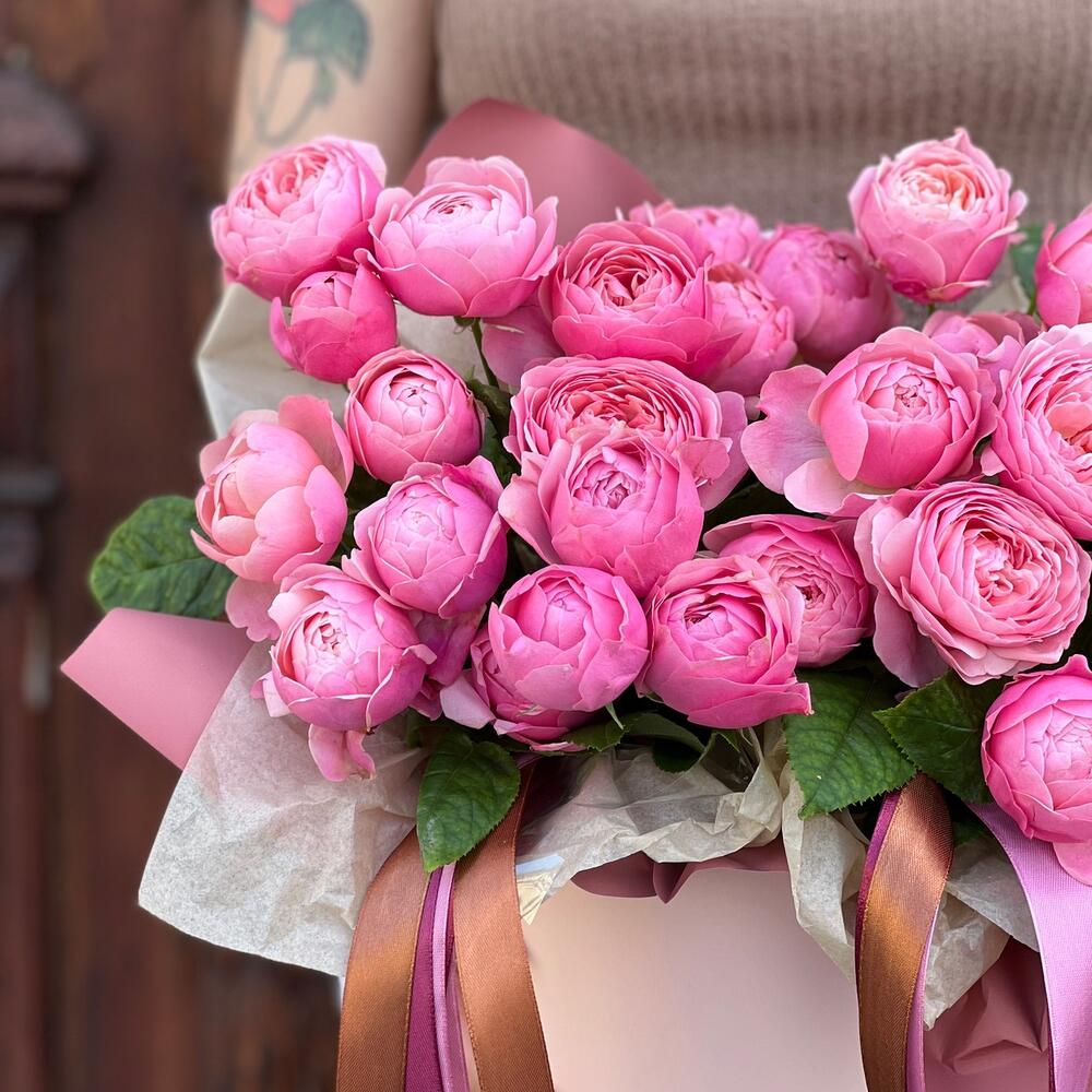 Лента атласная – 6 шт.Тишью – 1 шт.Коробка шляпная – 1 шт.Пленка матовая – 1 шт.Оазис флористический – 1 шт.роза пионовидная кустовая сильва пинк – 9 шт.
