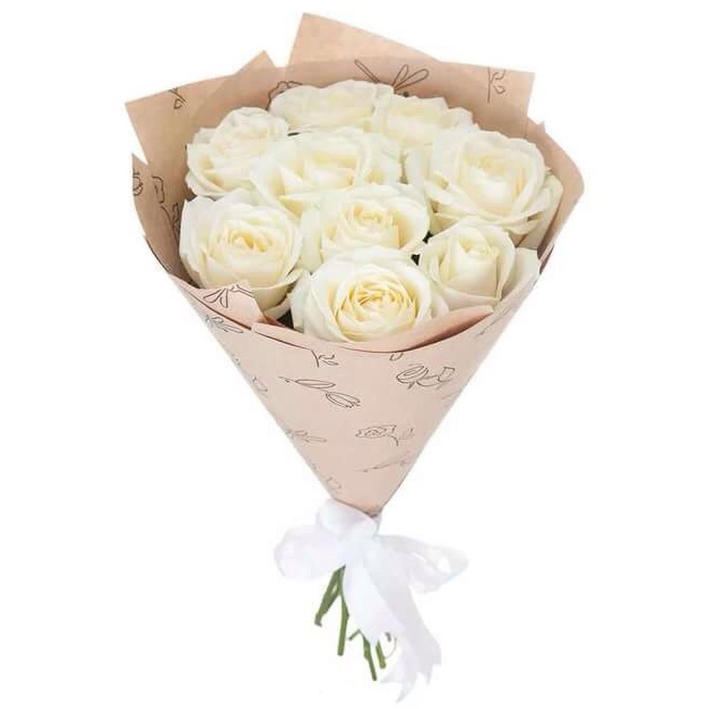 Атласная лента – 1 шт.Крафт упаковка – 1 шт.Роза белая 50 см – 9 шт.