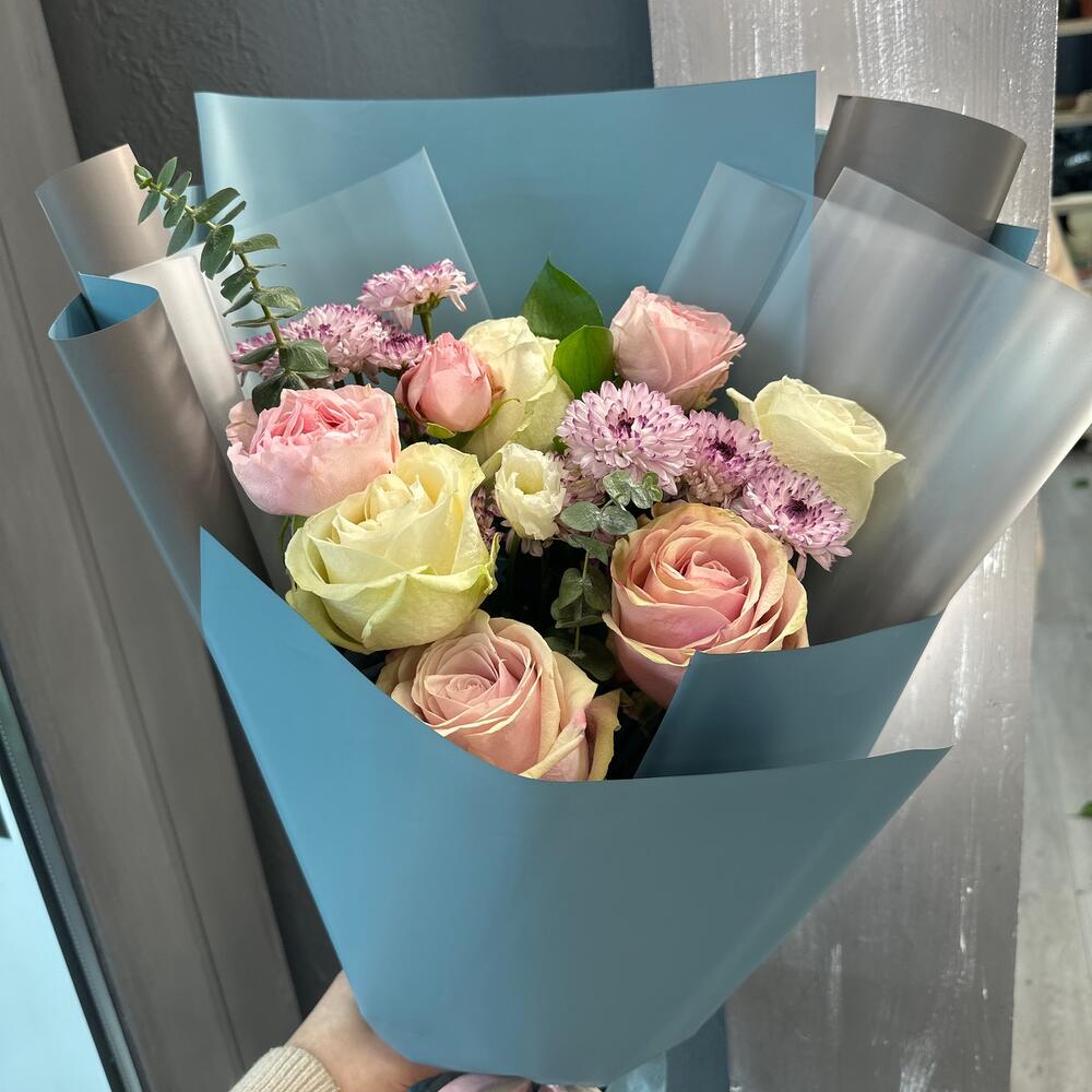 Роза – 5 шт.Сантини – 3 шт.Роза кустовая – 1 шт.Рускус – 1 шт.Эвкалипт – 2 шт.Упаковка дизайнерская – 4 шт.