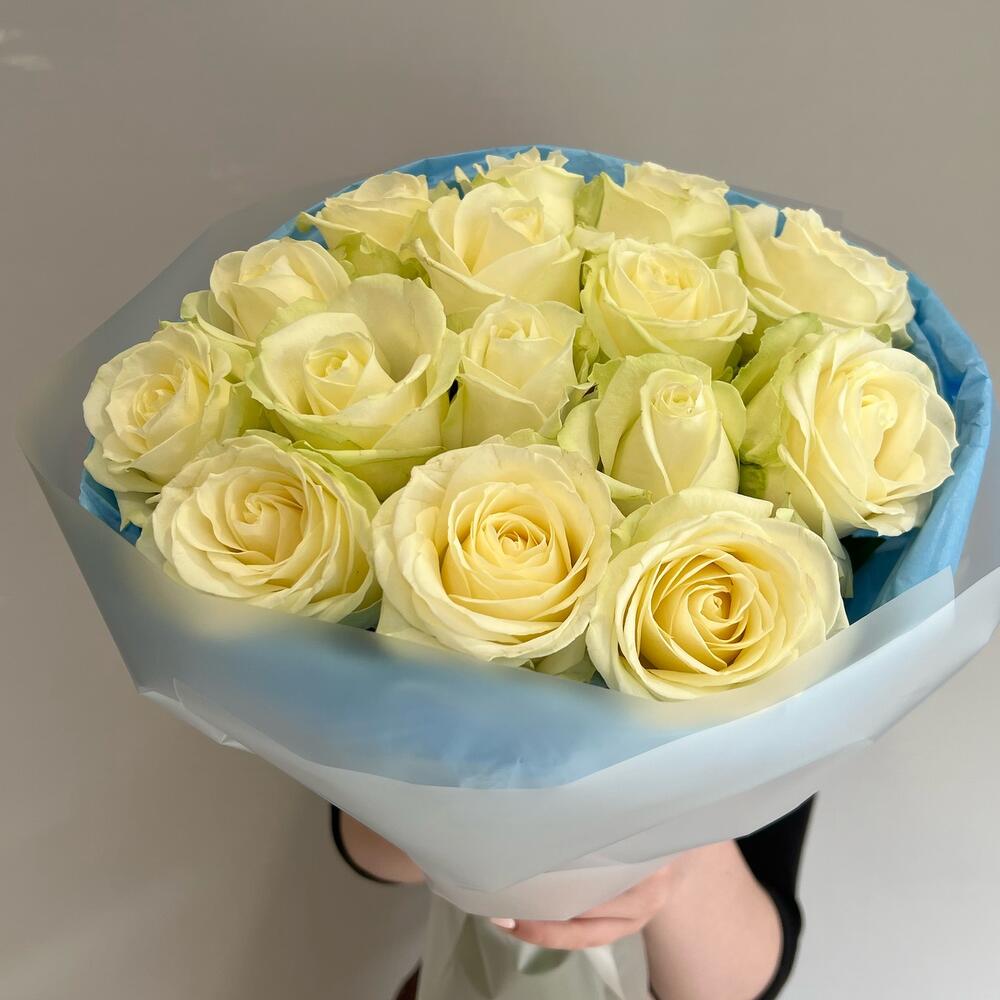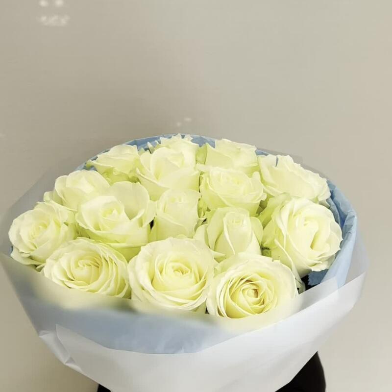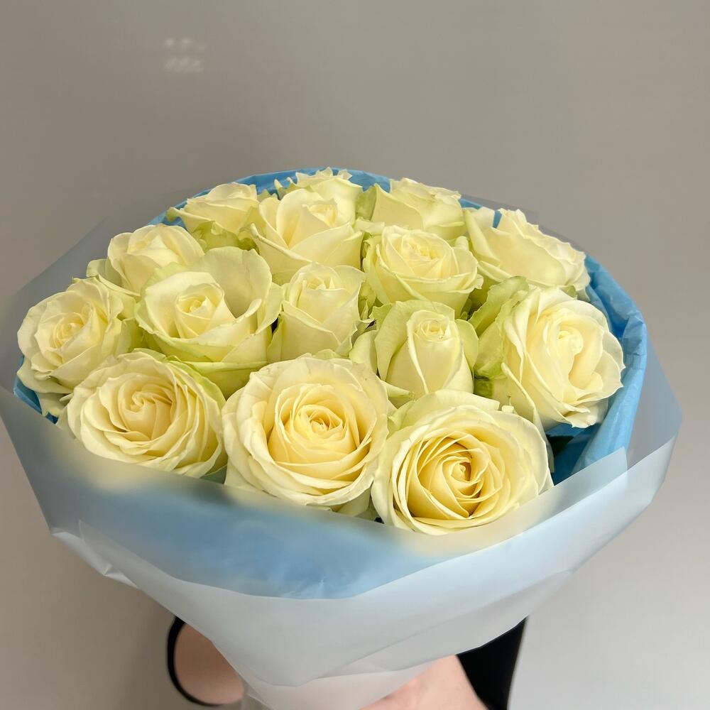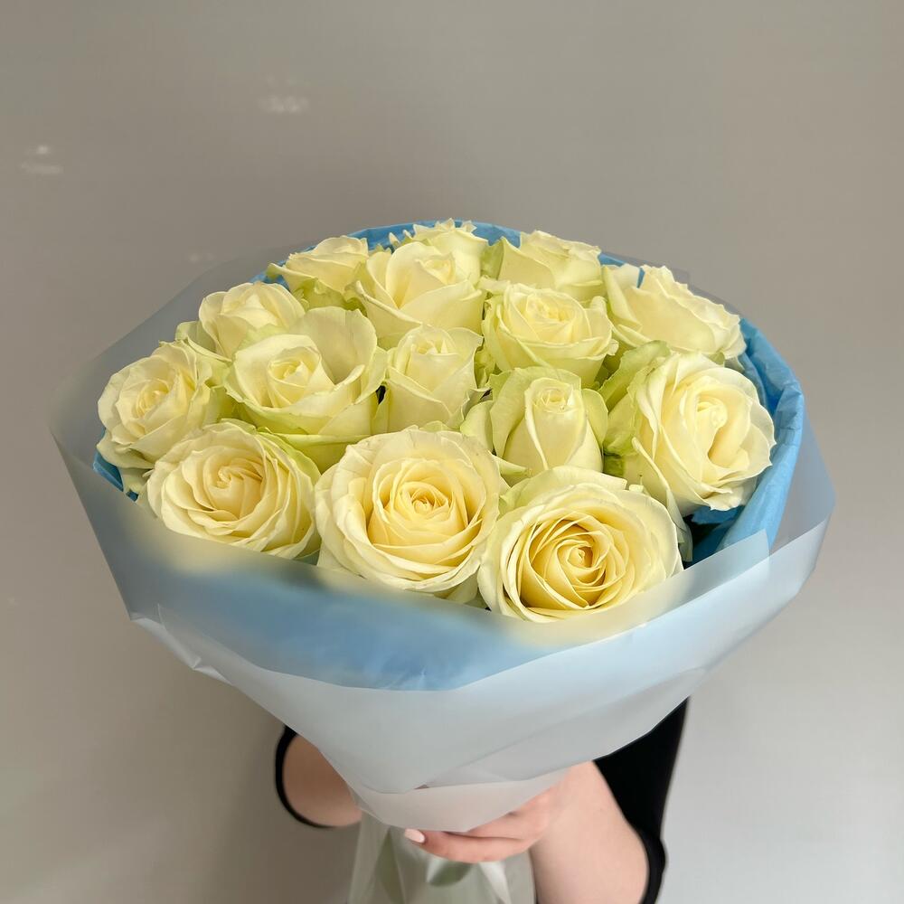 Роза – 15 шт.Лента атласная – 2 шт.Упаковка дизайнерская – 3 шт.