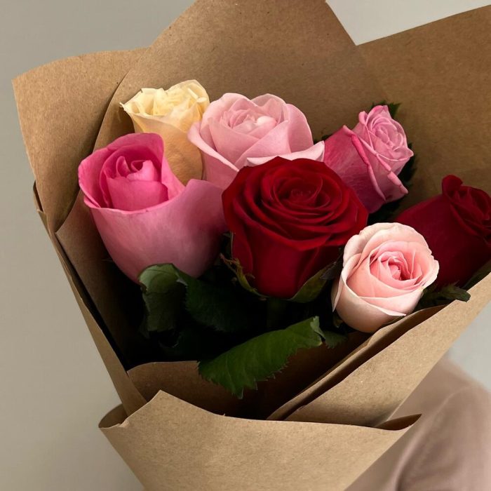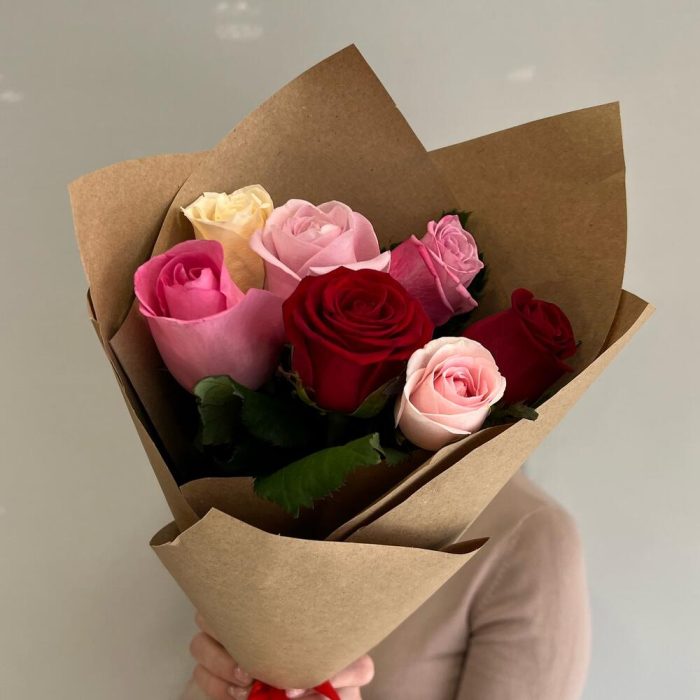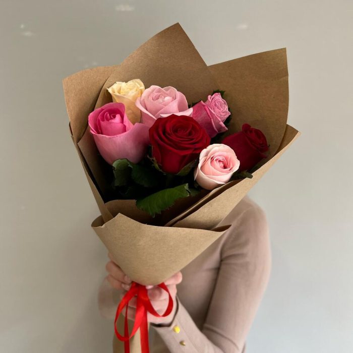 Букет из 7 разноцветных роз в упаковке