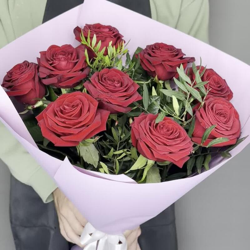 Лента атласная – 1 шт.Фисташка – 2 шт.Упаковка дизайнерская – 1 шт.Роза одноголовая россия – 9 шт.