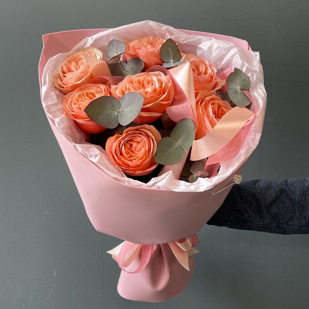 Букет из пионовидных персиковых роз и эвкалипта