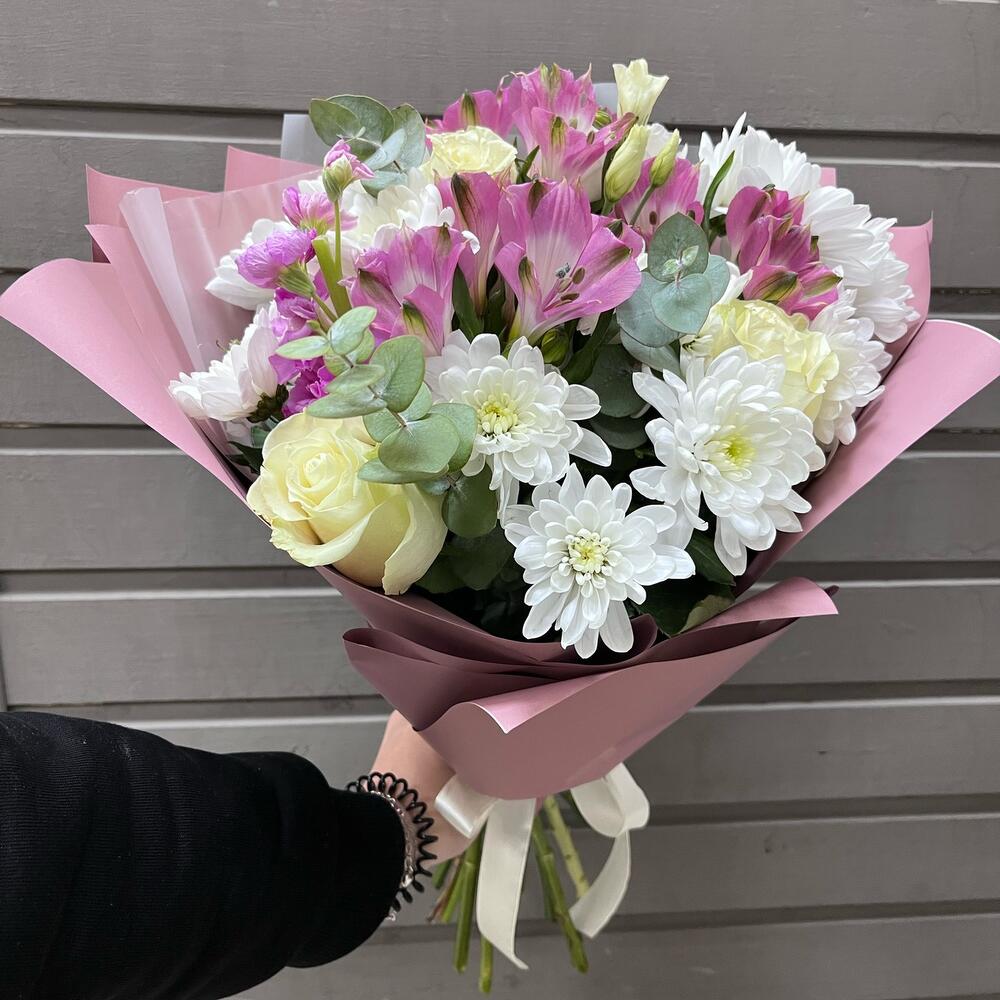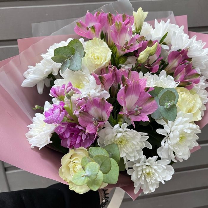 Хризантема кустовая – 3 шт.Роза – 3 шт.Альстромерия – 3 шт.Эвкалипт – 2 шт.Эустома – 2 шт.Маттиола – 1 шт.Оформление – 1 шт.