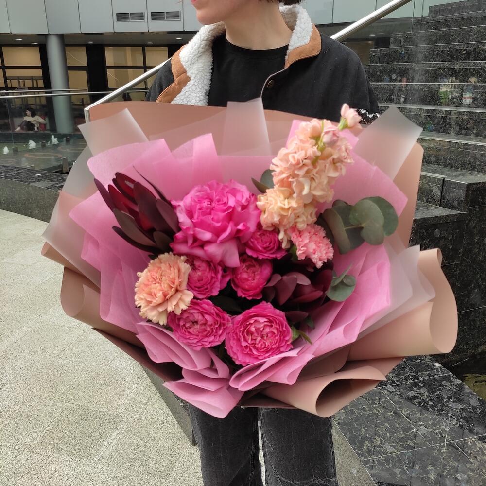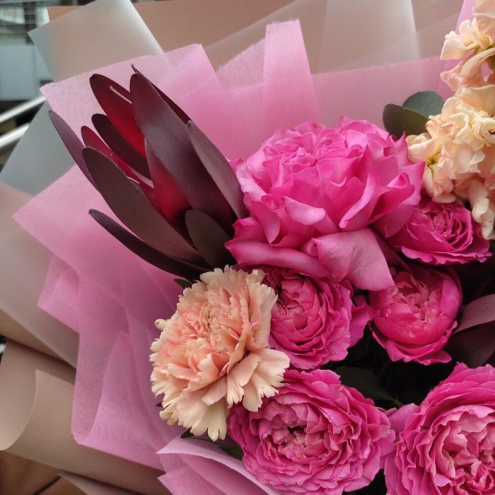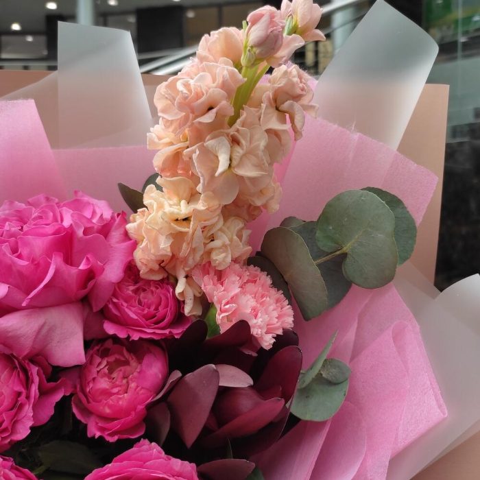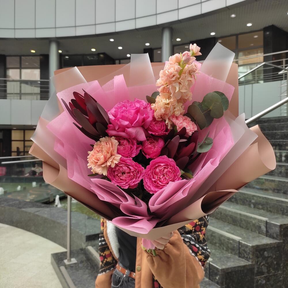 Роза кустовая пионовидная – 1 шт.Роза пионовидная – 1 шт.Диантус – 2 шт.Маттиола – 1 шт.леокендрон – 2 шт.Эвкалипт – 1 шт.Лента – 2 шт.Упаковка дизайнерская – 2 шт.