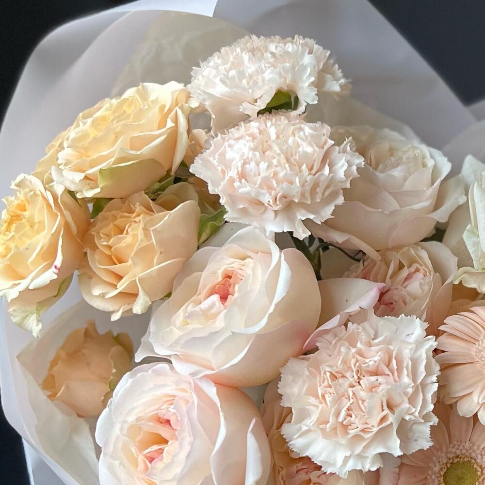 Одноголовая роза – 4 шт.Гербера – 5 шт.Диантус – 3 шт.Пионовидная роза – 5 шт.Кустовая роза – 1 шт.декоративная упаковка – 1 шт.Атласная лента – 1 шт.