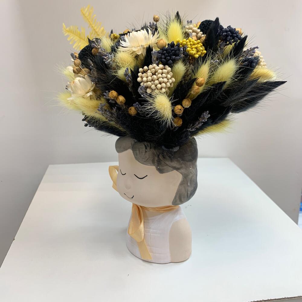 Кашпо керамическое – 1 шт.Лагурус (сухоцвет) – 75 шт.лен сухоцвет – 17 шт.Роза стабилизированная – 1 шт.Краспедия – 3 шт.Лаванда (сухоцвет) – 50 шт.Гелихризум – 5 шт.Озотамнус – 11 шт.папоротник стабилизированный – 2 шт.Лента атласная – 1 шт.