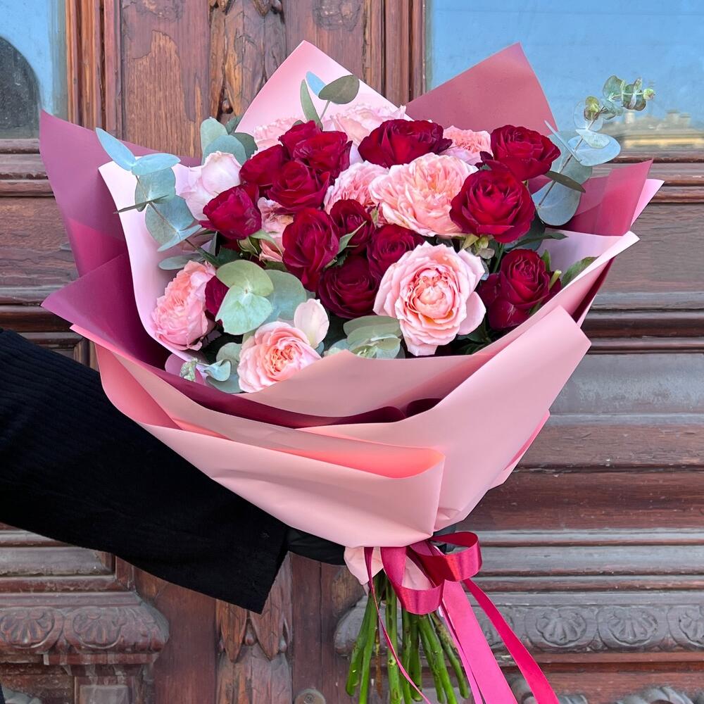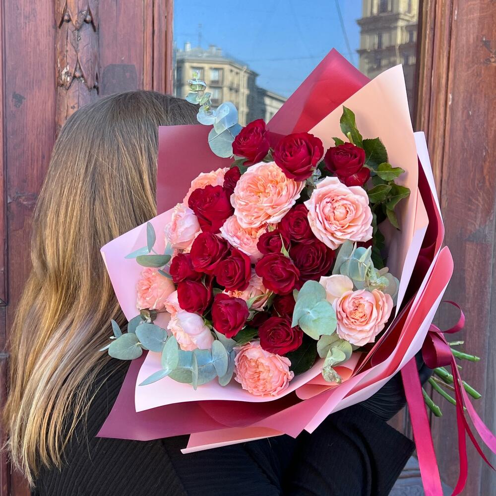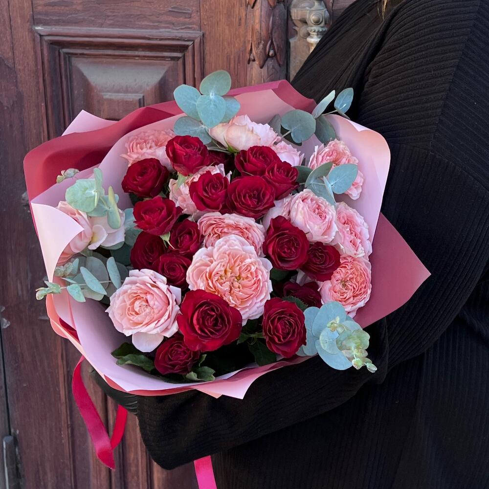 Эвкалипт – 3 шт.Лента атласная – 2 шт.Пленка матовая – 5 шт.роза пионовидная кустовая джульетта – 4 шт.роза кустовая пионовидная ред трендсеттер – 5 шт.