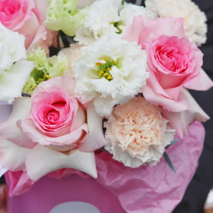 Лизиантус – 2 шт.Тюльпан – 3 шт.Гвоздика – 5 шт.Шляпная коробка – 1 шт.Французская роза – 3 шт.Открыточка с вашими пожеланиями – 1 шт.Шоколадка – 1 шт.