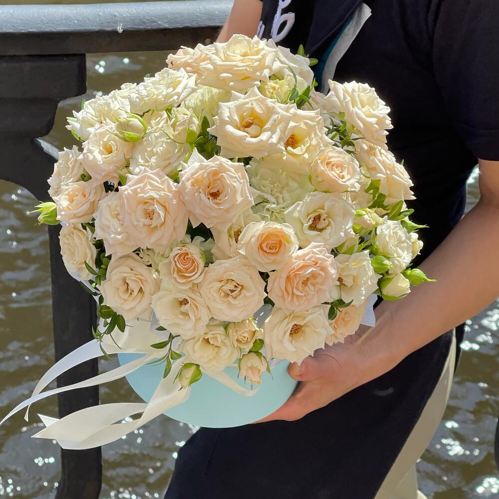 Роза кустовая – 9 шт.Коробка шляпная – 1 шт.Оазис флористический – 1 шт.Фисташка – 2 шт.Тишью – 2 шт.Лента атласная – 2 шт.Гвоздика одноголовая – 5 шт.