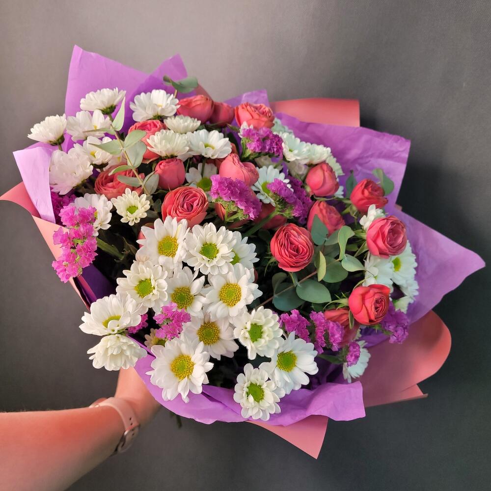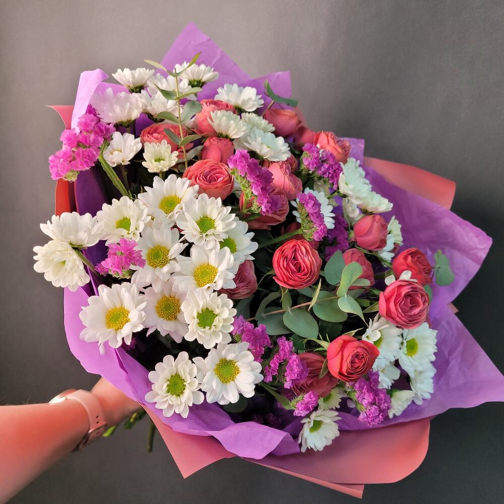 Роза кустовая пионовидная – 4 шт.Сантини – 5 шт.Статица – 2 шт.Эвкалипт – 2 шт.Упаковка дизайнерская – 1 шт.Лента атласная – 1 шт.
