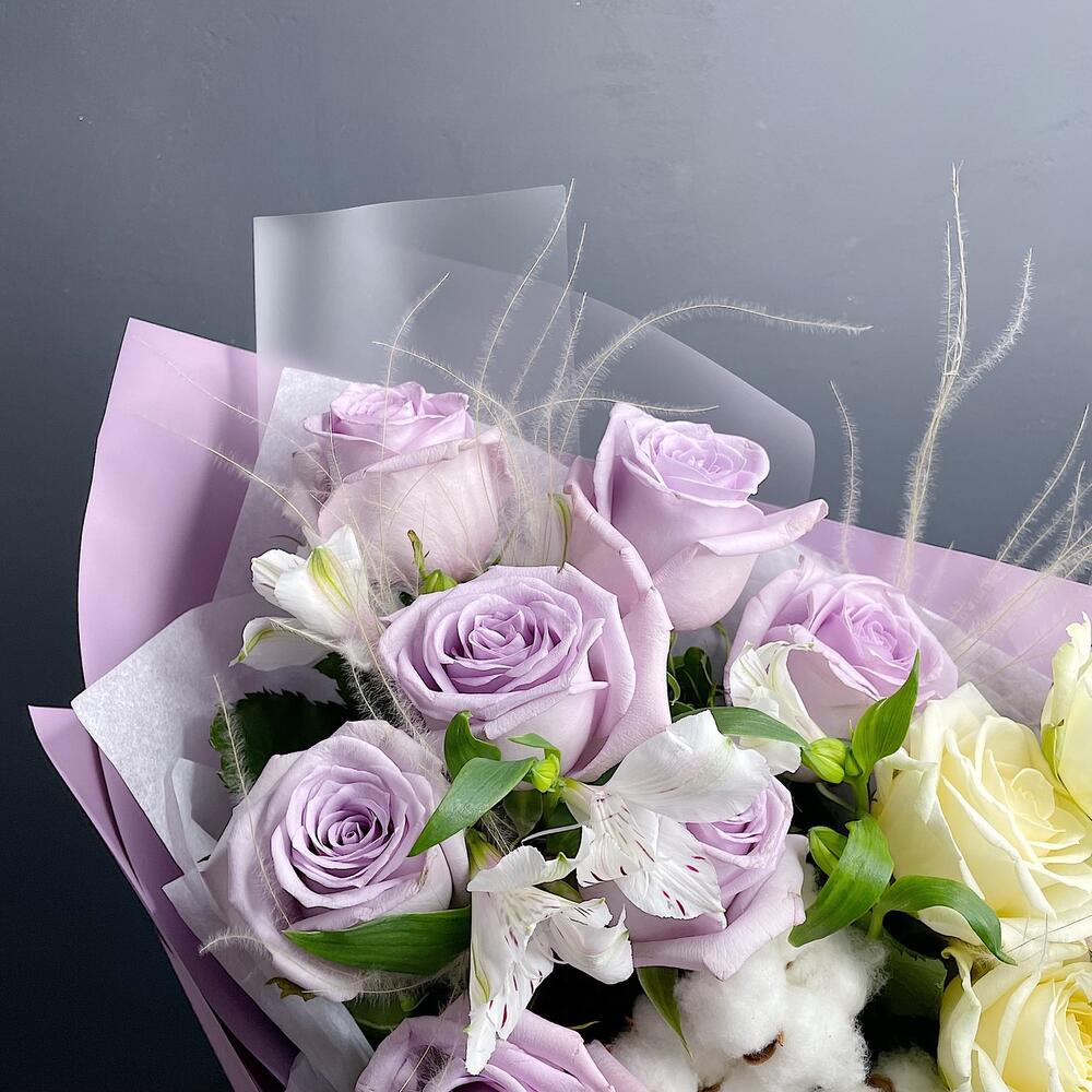 Альстромерия – 2 шт.Хлопок – 3 шт.Роза белая – 5 шт.Роза сиреневая – 7 шт.Упаковка дизайнерская – 1 шт.стифа пучок – 4 шт.