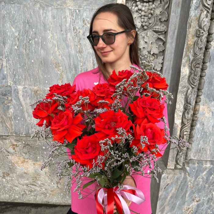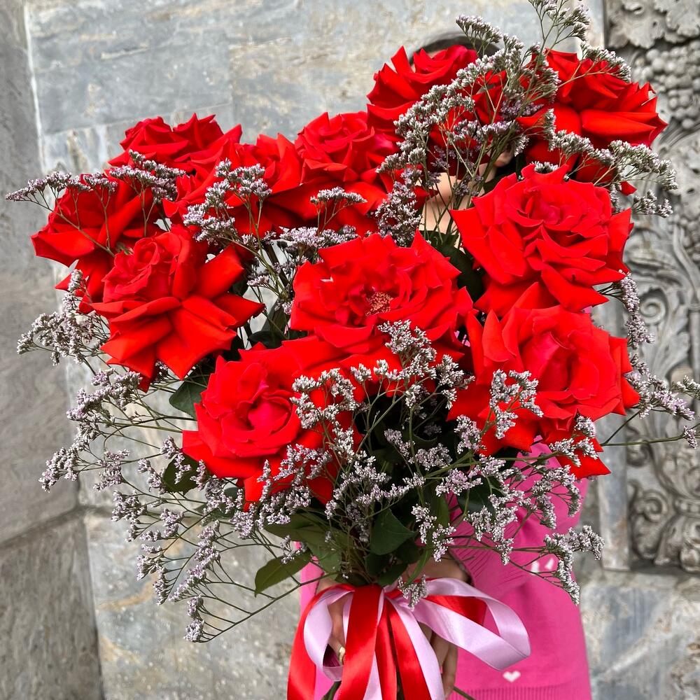 Лимониум – 3 шт.Лента атласная – 2 шт.французская премиум роза нина – 11 шт.