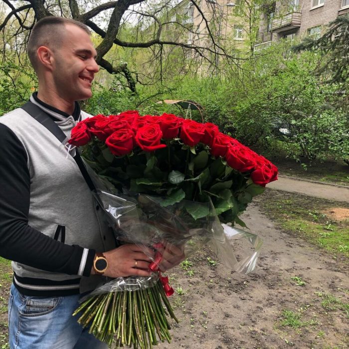 розы красные 70 см – 101 шт.Упаковка дизайнерская – 2 шт.Лента атласная – 1 шт.
