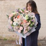 Садовый букет с пионовидными розами, эустомой, клематисом и эвкалиптом.Букет приедет в подарочной коробке, с рекомендациями по уходу за цветами.При необходимости, если букет с нежными цветами или ему предстоит весомое время в дороге – то цветы мы отравляем на воде, останется лишь аккуратно снять кулёчек с водой и поставить букет в подходящую вазу.К каждому букету мы подписываем открытку с вашим посланием – эта услуга, так же в подарок.