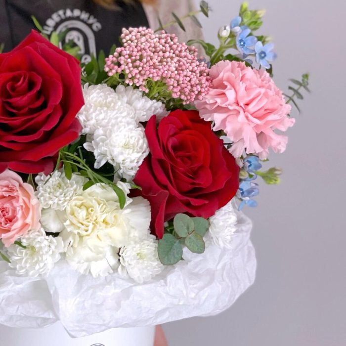 Шляпная коробка с красными розами и незабудками