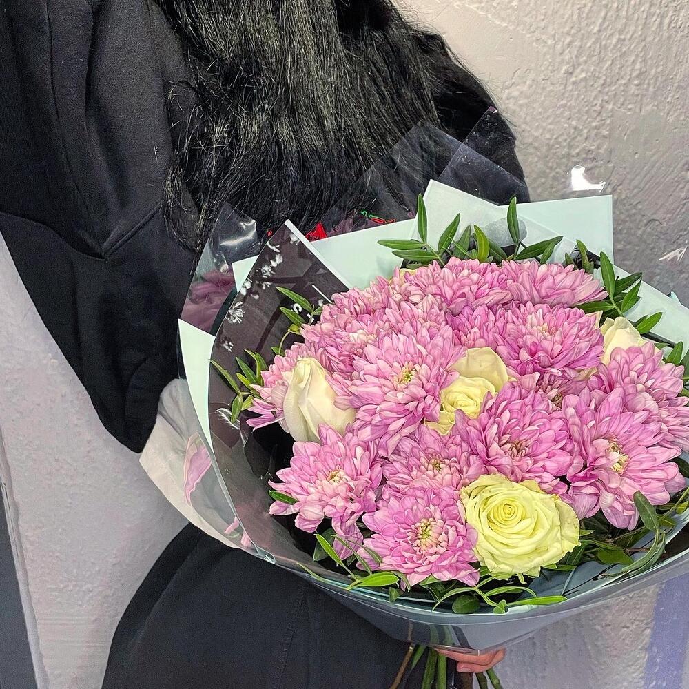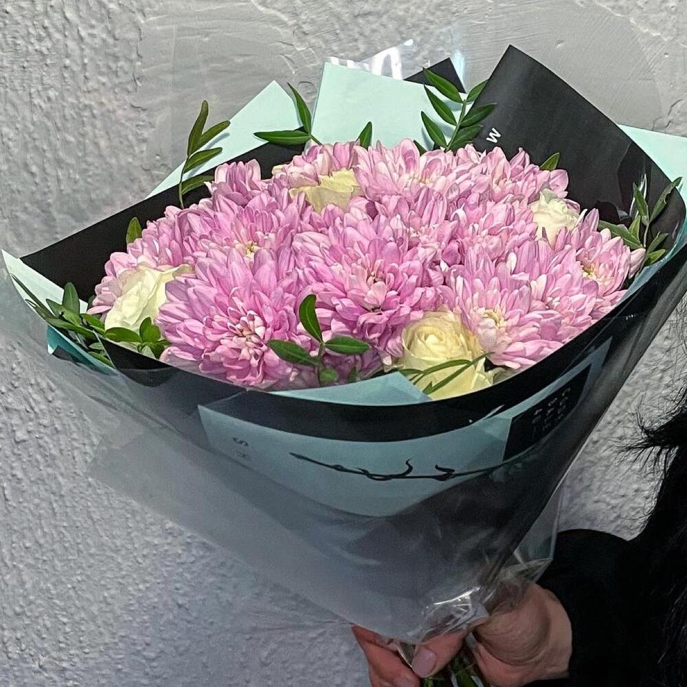 Хризантема кустовая – 4 шт.Роза Эквадор – 5 шт.фисташка зелень – 4 шт.Упаковка дизайнерская – 2 шт.