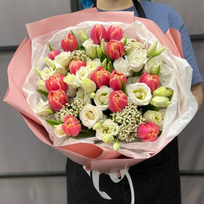 Тюльпан пионовидный – 15 шт.эустома белая – 4 шт.Озотамнус – 4 шт.Тишью – 2 шт.Пленка матовая – 5 шт.Лента атласная – 2 шт.