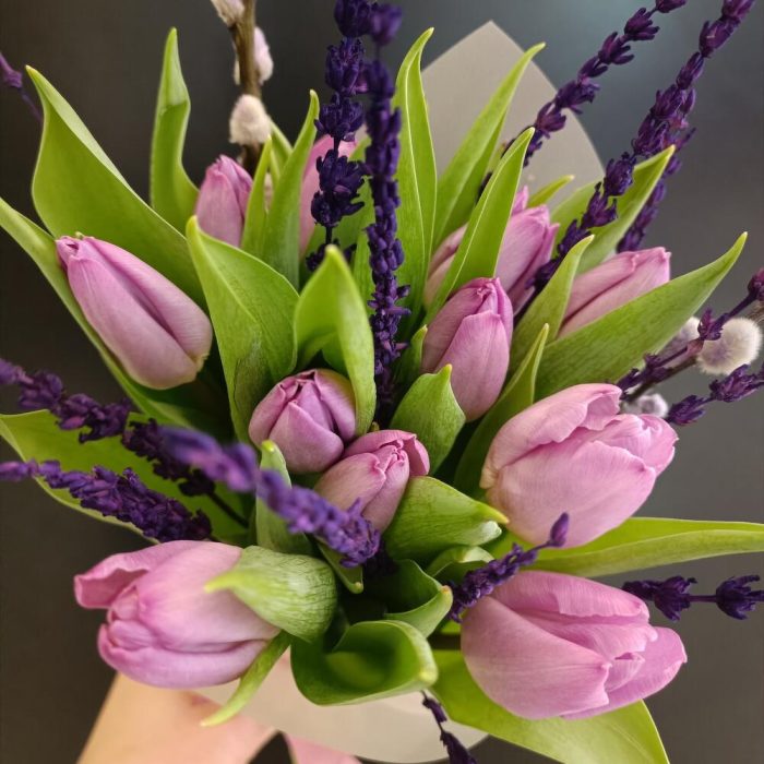 Букет с тюльпанами и лавандой